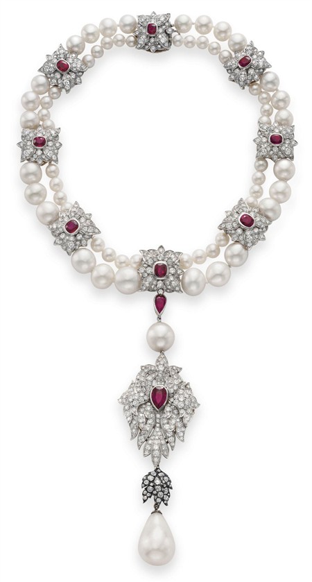 The star of the night came from under the sea: Ms Taylor's La Peregrina natural pearl, diamond, ruby, and cultured pearl necklace (below) went under the hammer for $11.8 million, including fees, breaking two world records at once: for an historic pearl, against the previous record of $2.5 million set by La Regente at Christie’s Geneva auction in 2005, and for a pearl jewel, surpassing the $7 million record paid for The Baroda Pearls at Christie’s New York, 2007.