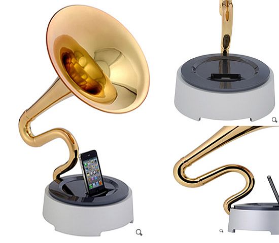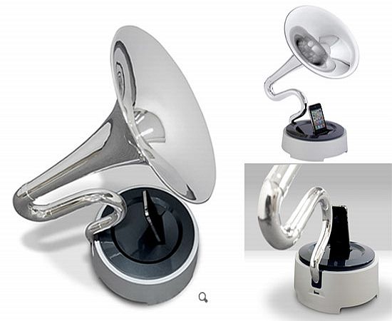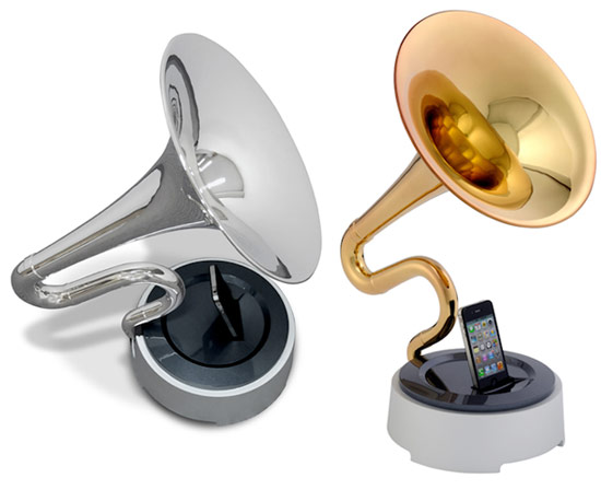 Trumstand horn-shaped iPhone speaker dock with gold and silver plating