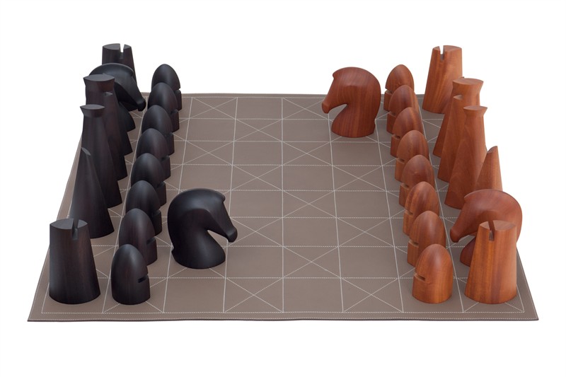 Giant-sized for maximum fun, the set with lovely rosewood and mahogany hand-sculpted pieces are laid out on a 95cm board in the most luscious and decadent etoupe Clemence taurillon leather: the entire setpiece will look equally good in your reading room when not in use.